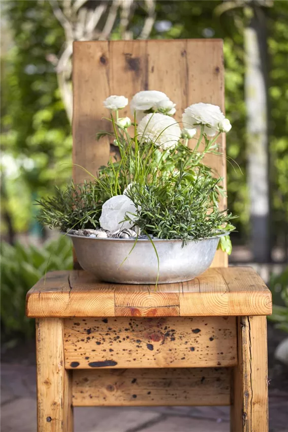 Ranunculus asiaticus Was kaputt ist, kommt auf den Sperrmüll – oder doch nicht? Gerade auf großen Grundstücken und in weitläufigen Gärten gibt es viele Ecken, in denen eine besondere und außergewöhnliche Deko gut zur Geltung kommt. Und wer hier Fantasie und Kreativität an den Tag legt, kann aus kaputten Dingen wie Gartenmöbeln noch das eine oder andere zaubern, was zumindest einen Sommer lang Freude macht.