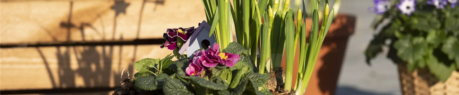 In den Pflanzschalen im Eingangsbereich oder auf der Terrasse lassen sich viele Dekoartikel mit den Pflanzen zusammen arrangieren. Ob Tonkrüge oder Keramiktiere, Holzstecker mit einem „Willkommens-Schild“ oder einem Osterhasen, Reisigzweige mit winterlichem Schmuck – der Fantasie sind hier keine Grenzen gesetzt. Das alles lässt sich unkompliziert und schnell erneuern und bildet einen Hingucker für die Gäste, die den Hauseingang betreten.