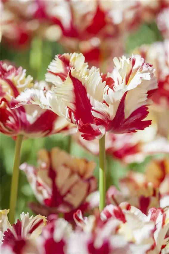 Tulipa 'Double Flaming Parrot' Eine so beliebte Pflanze wie die Tulpe lädt natürlich dazu ein, mit ihren Farben und Formen zu spielen. Es gibt viele Züchtungen, die sich sehen lassen können. Unvergleichlich ist zum Beispiel die Papageien-Tulpe mit ihren federartigen, zerfaserten Rändern. Die Sorte „Flaming Parrot“ präsentiert flammende Blütenblätter, die in zwei Farben gestreift sind. Sie erinnern an Federn eines Papageis. Wenn Sie ein Liebhaber ungewöhnlicher Farbkombinationen sind, greifen Sie am besten zu Rembrandt-Tulpen. Deren Ursprung ist ungewöhnlich: ihr Flor war die Folge einer Viruserkrankung. Züchtungen der Rembrandt-Tulpen, die man heute im Handel erhält, sind natürlich gesund. Sie sind ein Blickfang in jedem Gartenarrangement für den Frühling.