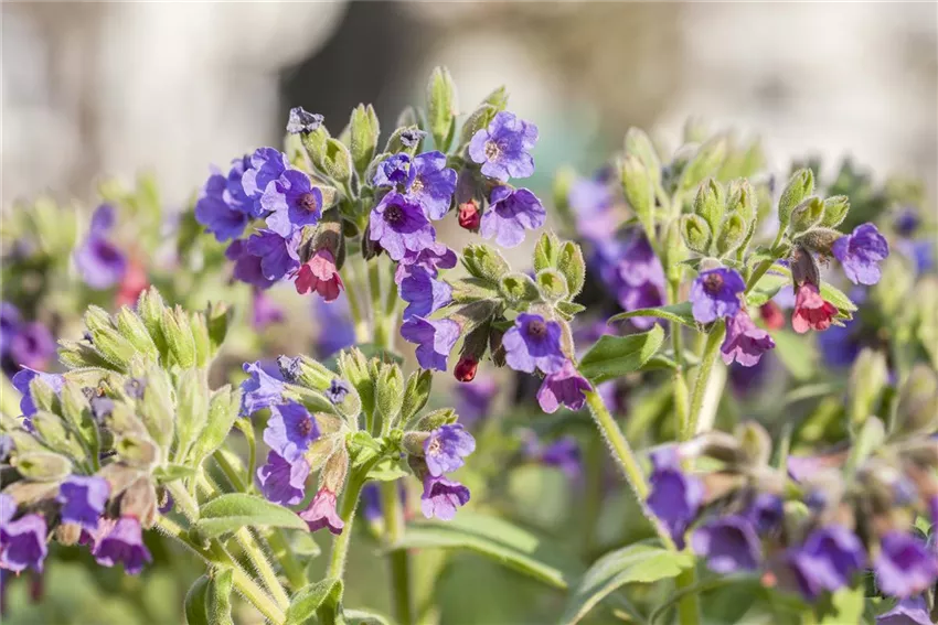 Pulmonaria mollis Die klassischen Frühblüher sind Tulpe, Narzisse und Co. Aber was früh blühen will, muss nicht immer eine Zwiebel haben. Es gibt auch einige Stauden, die schon früh im Jahr für Farbkleckse sorgen. Wer seinen Balkon also mal mit etwas untypischen Frühblühern bepflanzen will, kann das mit gefüllten Primeln, Lungenkraut, Lerchensporn und Vergissmeinnicht machen. Lerchensporn und Lungenkraut blühen in den schönsten Blautönen, die die Natur zu bieten hat und zusammen mit den gefüllten Primeln und dem Vergissmeinnicht, bringen sie ganz ohne Zwiebel früh frische Farbe in den Balkonkasten. Wer zusätzlich zum Balkon einen Garten besitzt, kann Lerchensporn und Lungenkraut nach der Blüte ganz einfach ins Beet pflanzen.