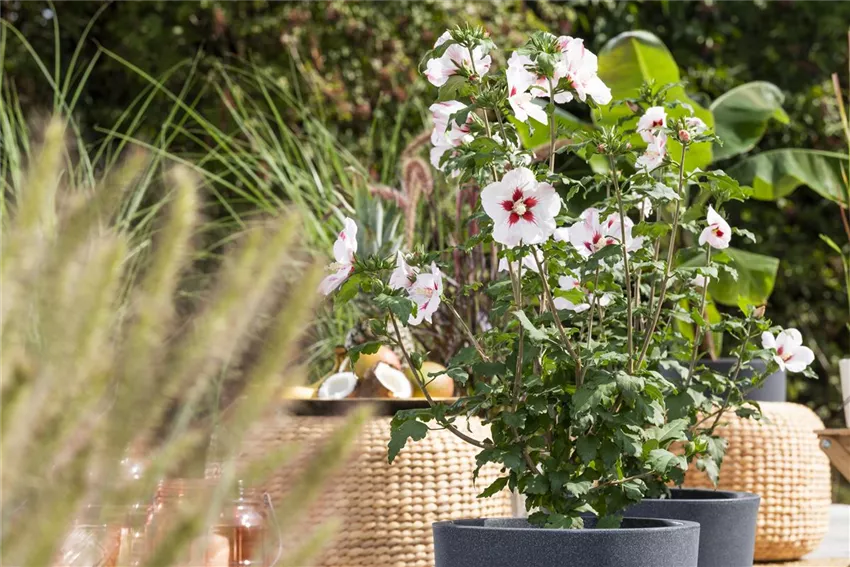 Hibiscus syriacus, weiß-rot Wer im Sommer schon einmal von einem abgedunkelten Wohnzimmer in die pralle Sonne nach draußen gegangen ist, der weiß, wie stark die Sonne blenden kann. Und so, wie sich die Augen an die Sonne gewöhnen müssen, müssen das auch die Kübelpflanzen, die aus ihrem Winterquartier nach draußen dürfen. Die Pflanzen müssen erst einmal an die Sonne gewöhnt werden und auch, wenn sie sonst einen vollsonnigen Standort lieben, sollten sie die erste Zeit erst einmal im Schatten verbringen und sich an die Sonnenstrahlung gewöhnen. Nach den Monaten mit wenig oder künstlicher Beleuchtung sind die Kübelpflanzen sehr anfällig für Sonnenbrand. Sind allerdings noch Schnee und Frost angesagt, sollten die Kübelpflanzen rechtzeitig abgedeckt oder wieder ins Haus gebracht werden.