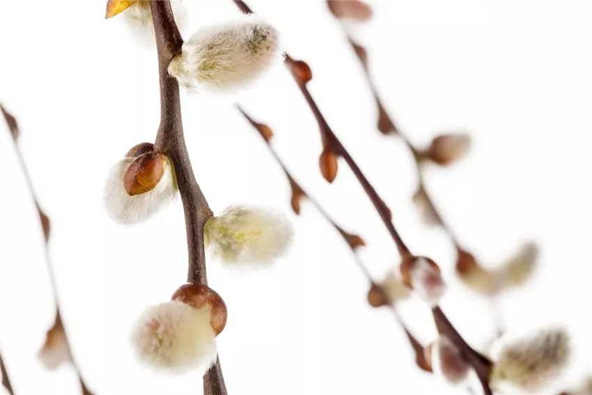 Salix caprea 'Pendula' Die Kätzchen-Weide gehört auch zu den Frühlingsboten. Auch wenn ihre „Kätzchen“ eher plüschig und gut eingepackt aussehen, ist Ostern ziemlich nahe, wenn die Kätzchen-Weide blüht. Die Kätzchen-Weide hat zwei Gesichter: einzelne Pflanzen tragen entweder nur männliche oder nur weibliche Weidekätzchen. Die männlichen Blütenstände sind in der Regel größer und sind über und über mit gelben Staubgefäßen bedeckt. Die weiblichen Weidekätzchen sind silbergrau.