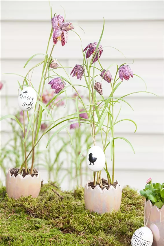 Fritillaria meleagris Vögel bereiten ihre Nester für ihren Nachwuchs vor und machen es ihnen besonders bequem. Das passiert jetzt auch mit dem Netz im Osterkranz. Dafür wird das kleine Nest mit Moos ausgekleidet, sodass eine flache Ebene entsteht. Die Eier werden oben so aufgeschlagen, dass die Öffnung groß genug ist, damit die Wurzeln der Pflanzen in die Eierschale passen. Die Eier werden dann ausgespült und bekommen mit Draht und Heißkleber ein Füßchen, mit dem die Eier ganz leicht in das Moos gesteckt werden können. Und dann können die Pflänzchen einziehen.