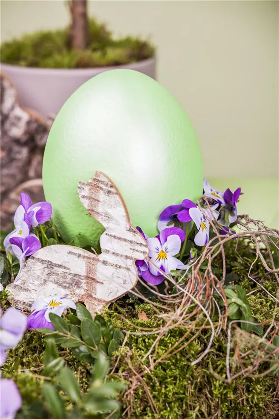 Viola cornuta Damit die Frühblüher in die Eierschalen einziehen können, werden sie aus ihren Töpfen geholt und die Erde vorsichtig abgeklopft. Dann werden sie in die Eierschalen gesetzt und mit etwas Erde leicht angedrückt. Mit einer Sprühflasche können die Pflanzen in den Eierschalen dann „angegossen“ werden. Die Sprühflasche dosiert die Wasserzufuhr, mit einer Gießkanne würde zu viel Wasser in die Eierschalen gelangen und sie würden überlaufen. Und dann kann der Osterkranz an die Tür gehangen werden.