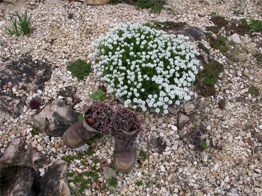 Splitt und Kies lassen den Steingarten gepflegt aussehen. Man muss regelmäßig Laub entfernen und den Kies harken, ansonsten fällt aber kaum Arbeit an. Nur nicht zu viel Düngen: die Mulchschicht aus Kies reicht aus. Eine andere schöne Idee sind Blumentöpfe in Kies. So kann man vor allem einen schmalen Vorgarten oder eine Rabatte als Steingarten anlegen. Mann kann die Blumenzwiebeln, zum Beispiel Tulpen, in Tontöpfe einpflanzen und diese anstelle einzelner Pflanzen im Boden versenken. Für eine einfachere Handhabung und einen ungewöhnlichen Look kann man die Töpfe über den Boden hinausragen lassen. Um die Töpfe herum wird der Kies verteilt. So kann man auch einjährige Blumenzwiebeln im Steingarten verwenden, ohne alles neu anlegen zu müssen. Durch die Topfhaltung kann man die Pflanzen leicht austauschen.