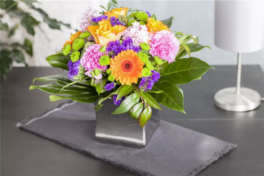 Schon eine einzelne, einfache Blüte fällt mehr auf, wenn sie von kräftig grünen Blättern, Gräsern, Farnen oder Kräutern umgeben ist. Ihren herbstlichen Dekorationen mit Chrysanthemen oder Astern können Sie durch Zweige mit bunten Früchten der Jahreszeit individuelles Flair verleihen. Außerdem bekommen die Sträuße mehr Fülle und lassen sich besser binden – eine wertvolle Hilfe vor allem bei unbelaubten oder starren Blütenstängeln, z.B. Gerbera oder Rosen. Auch Ungeübten gelingt so ein üppiges Blumengebinde. Gleichzeitig unterstreichen die Zutaten die Wirkung der Blüten oder fügen sich, farblich aufeinander abgestimmt, harmonisch in die Dekoration ein. Kräuter verströmen zusätzlich einen zarten Duft nach Sommer frische. Gräser mit überhängenden Rispen sorgen für Dynamik und Schwung.